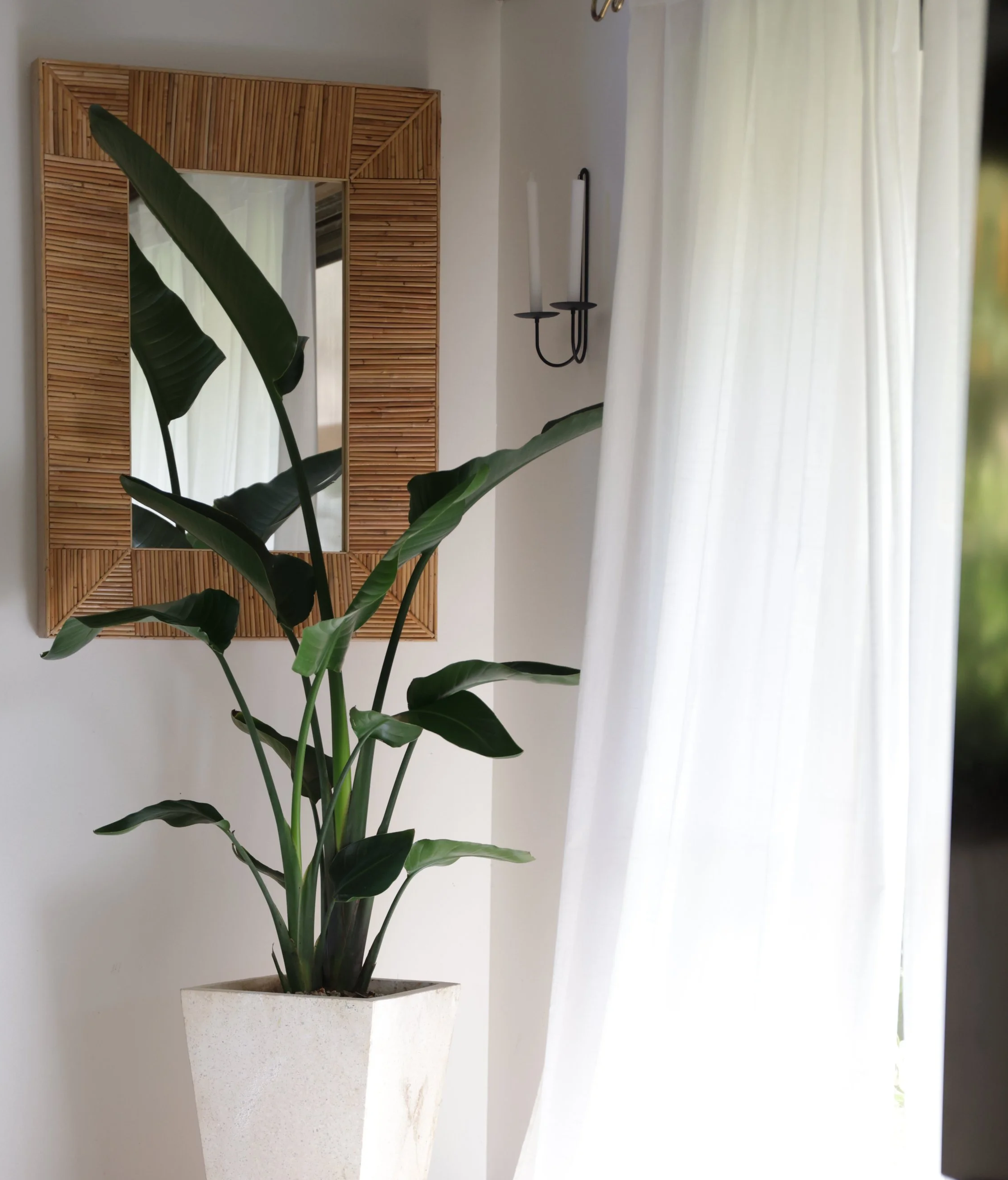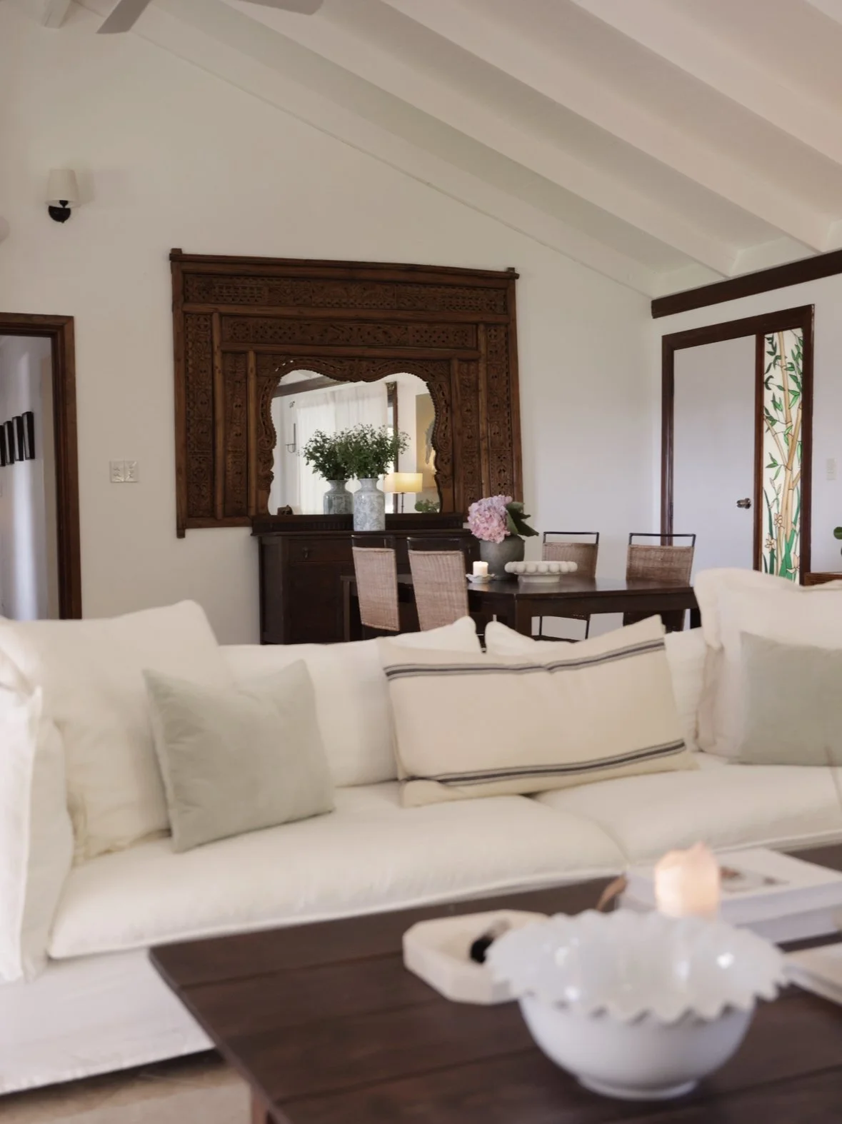 After: By introducing a neutral sofa, woven textures, and soft accent styling, the space now feels bright, cohesive, and welcoming. The dining zone was simplified with natural chairs and greenery, creating balance with the feature timber mirror.