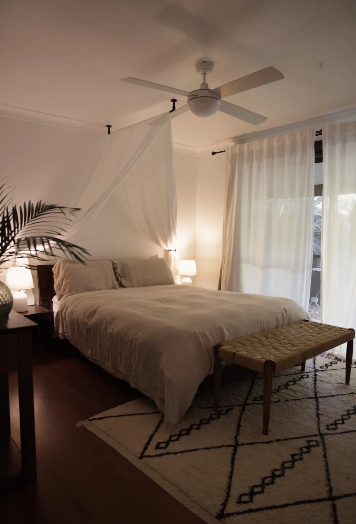 After: Layers of soft textiles, flowing curtains, and a canopy detail transformed the room into a serene retreat. The addition of a textured rug and natural bench adds both warmth and grounding.