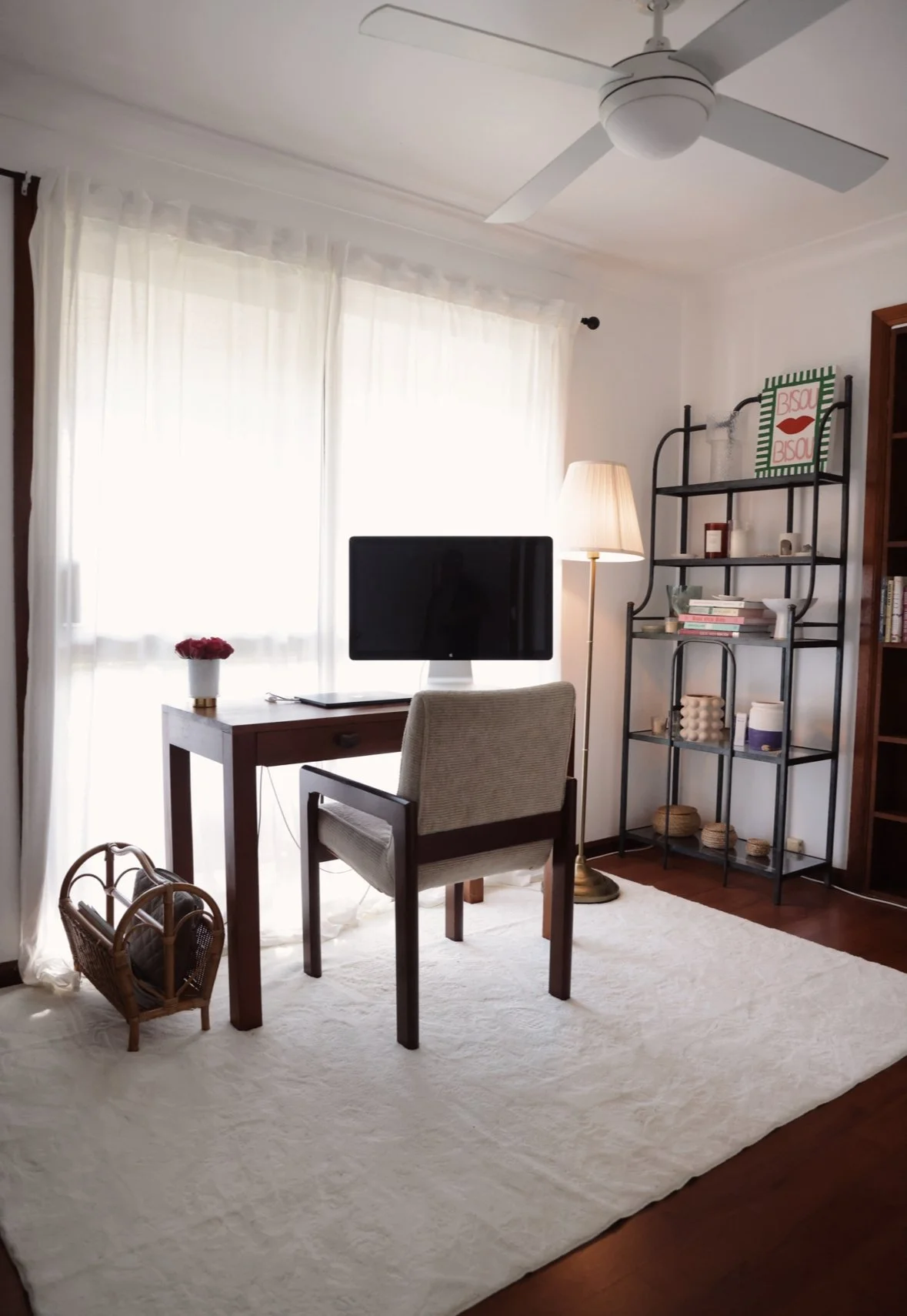 After: A clean desk, curated shelving, and sheer curtains created a light-filled home office that inspires focus while still feeling calm and homely.